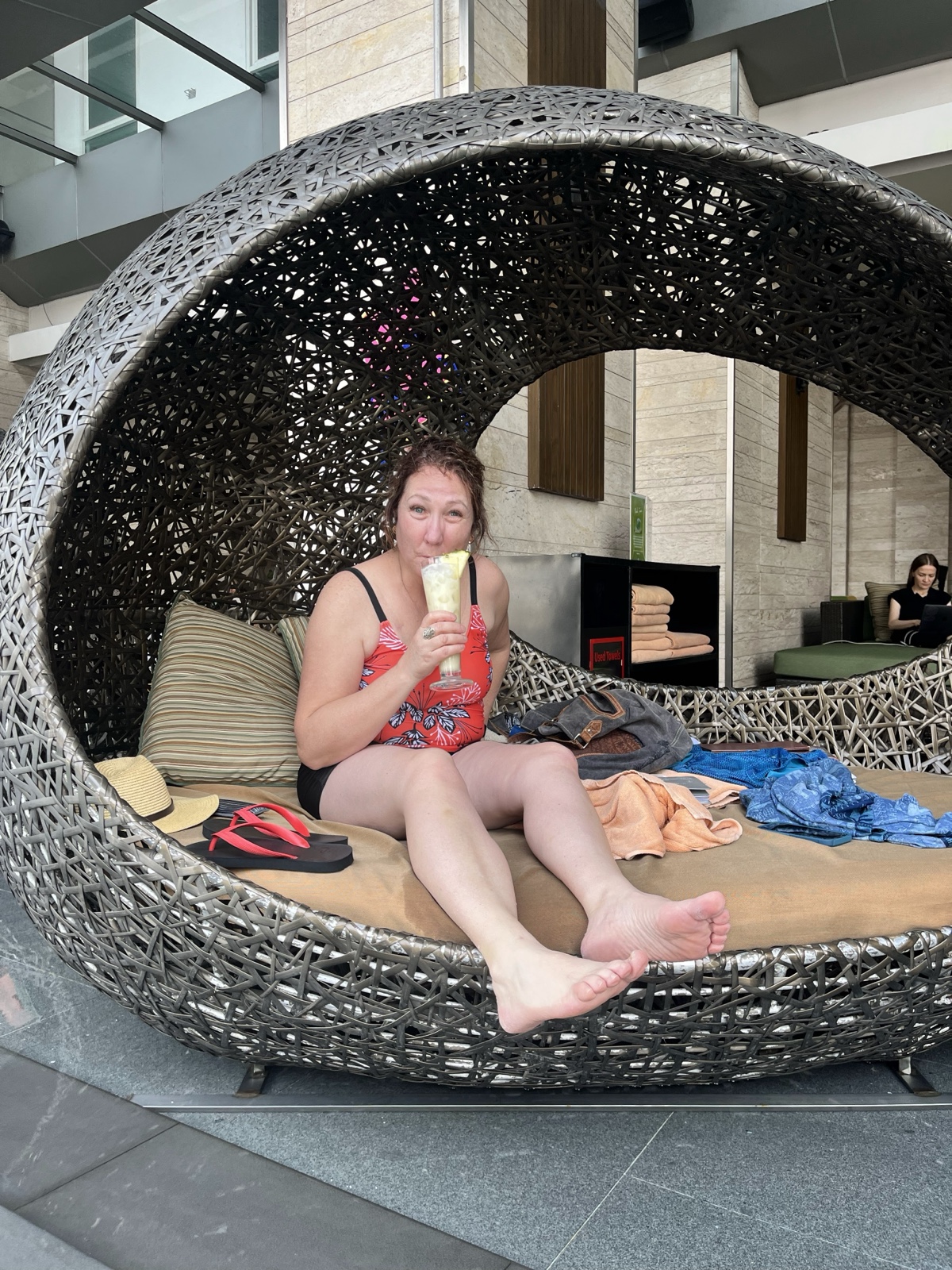 It was evening back home, so we chatted with Kelsi for a few minutes from the poolside pods.
