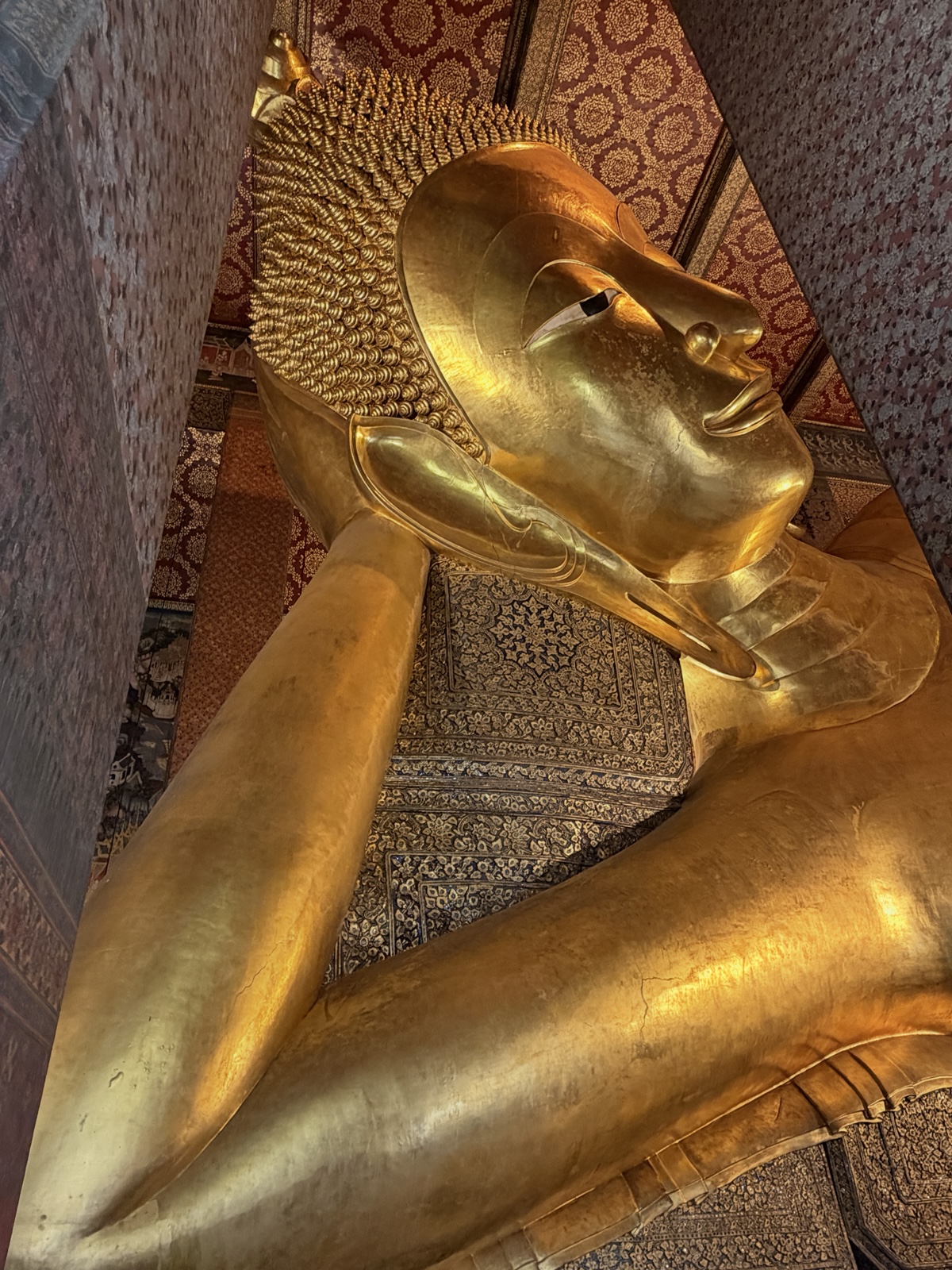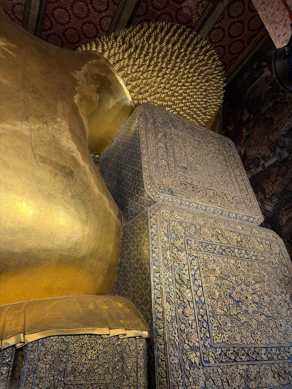 And at the bottom, you can see the fancy feet and finally the whole statue, which is about 150 feet long (46 meters). The patterns on the feet are really intricate.