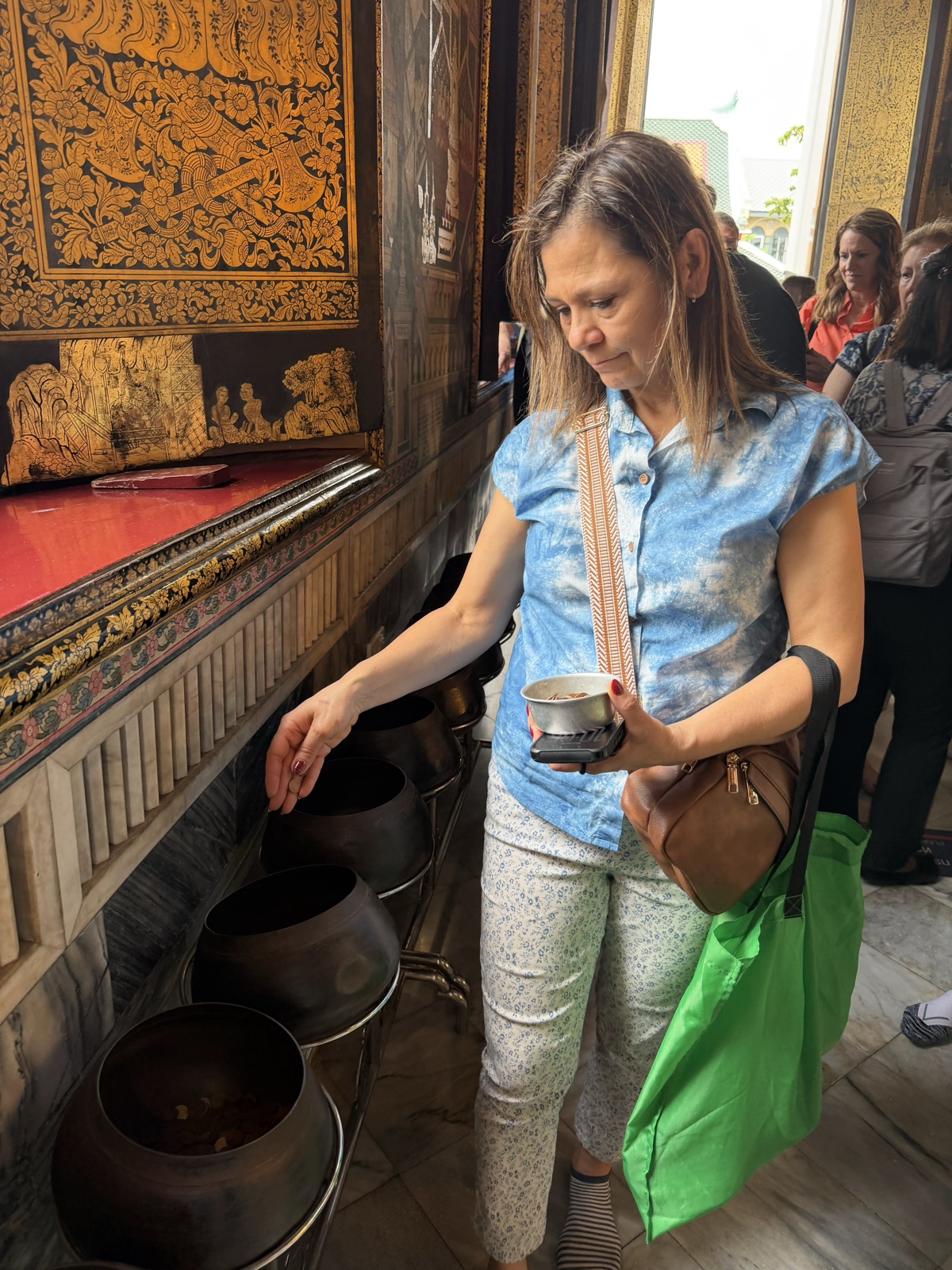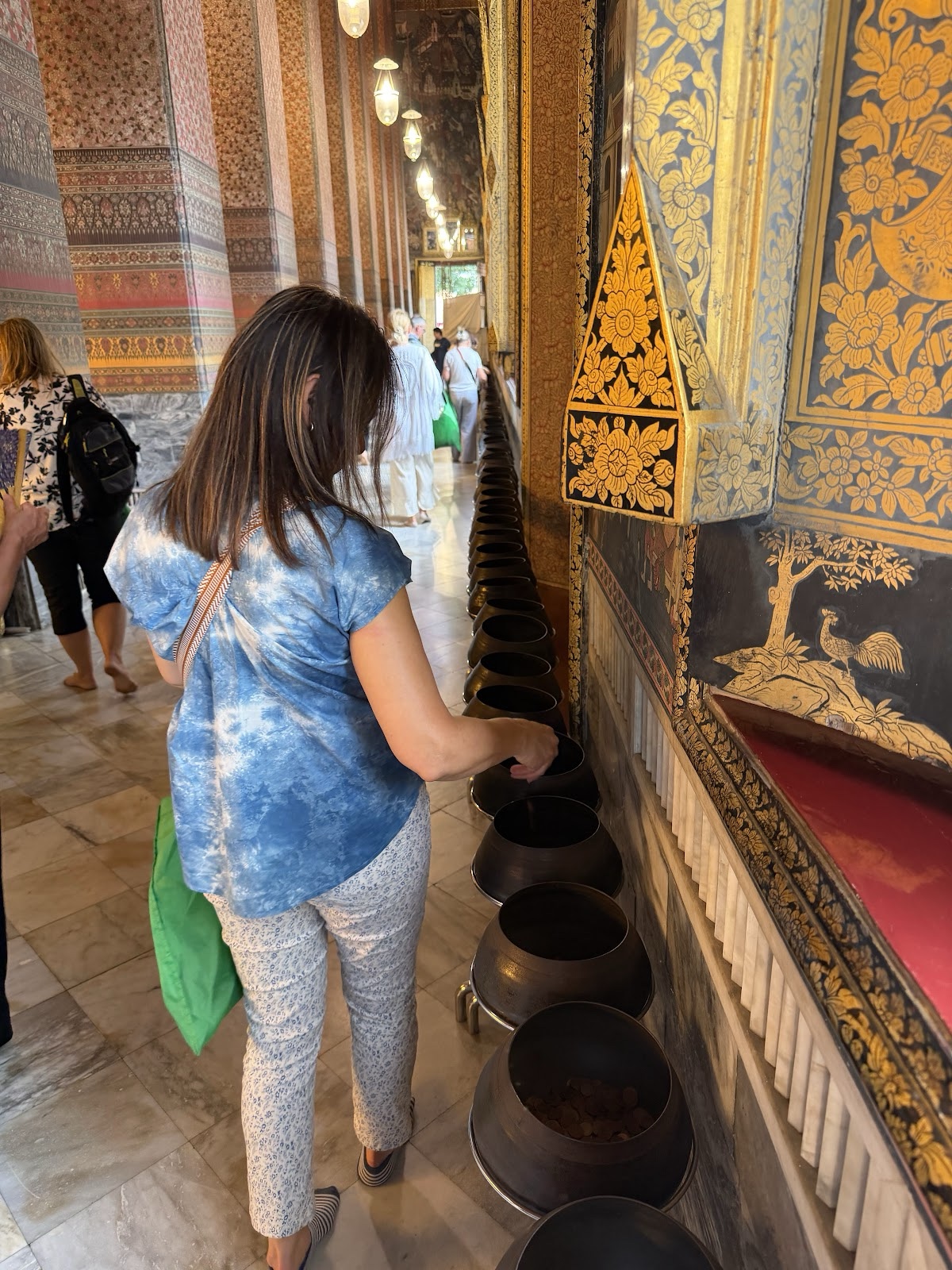 Linette has a friend who is Buddhist, and in her honor, she bought some little coins to drop in all 161 buckets along a wall.