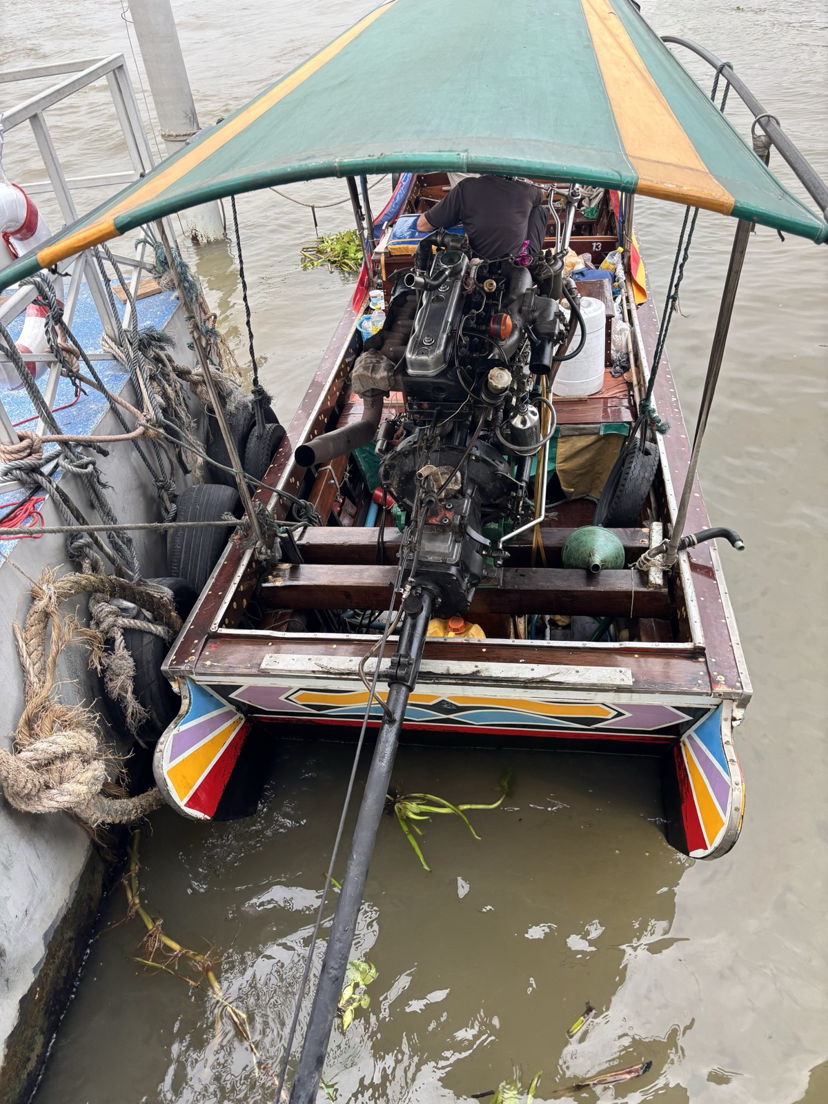 We gathered outside the hotel and got a pep talk from our trip host Tyler. Then we got on the BTS Skytrain and took it a short distance to the river, where we boarded two traditional "long-tail" boats. They are called that because a shaft sticks directly out the back with the propellor way out on the end. These boats tend to use recycled car engines, and are typically loud (no muffler) and powerful. Drivers can steer the boat with the propeller and lift it up out of the water easily if it gets shallow or to dodge debris.