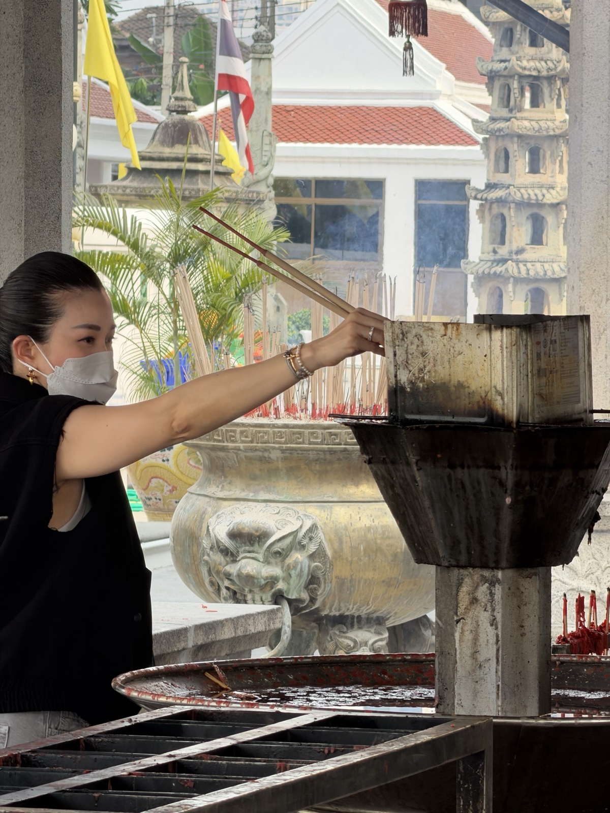 It looked like this lady was cooking with large chopsticks, but they are really incense sticks.
