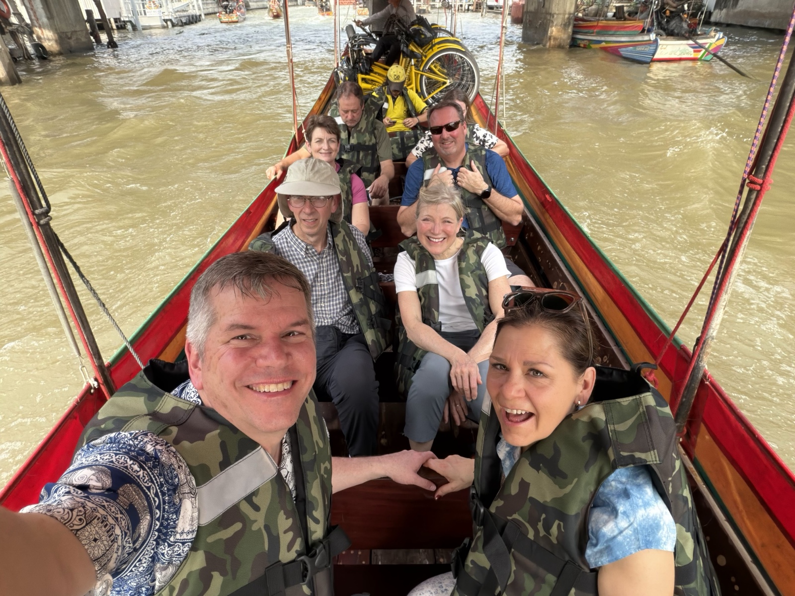 We gathered one more time in front of a school, and loaded our bikes back onto a long-tail boat.