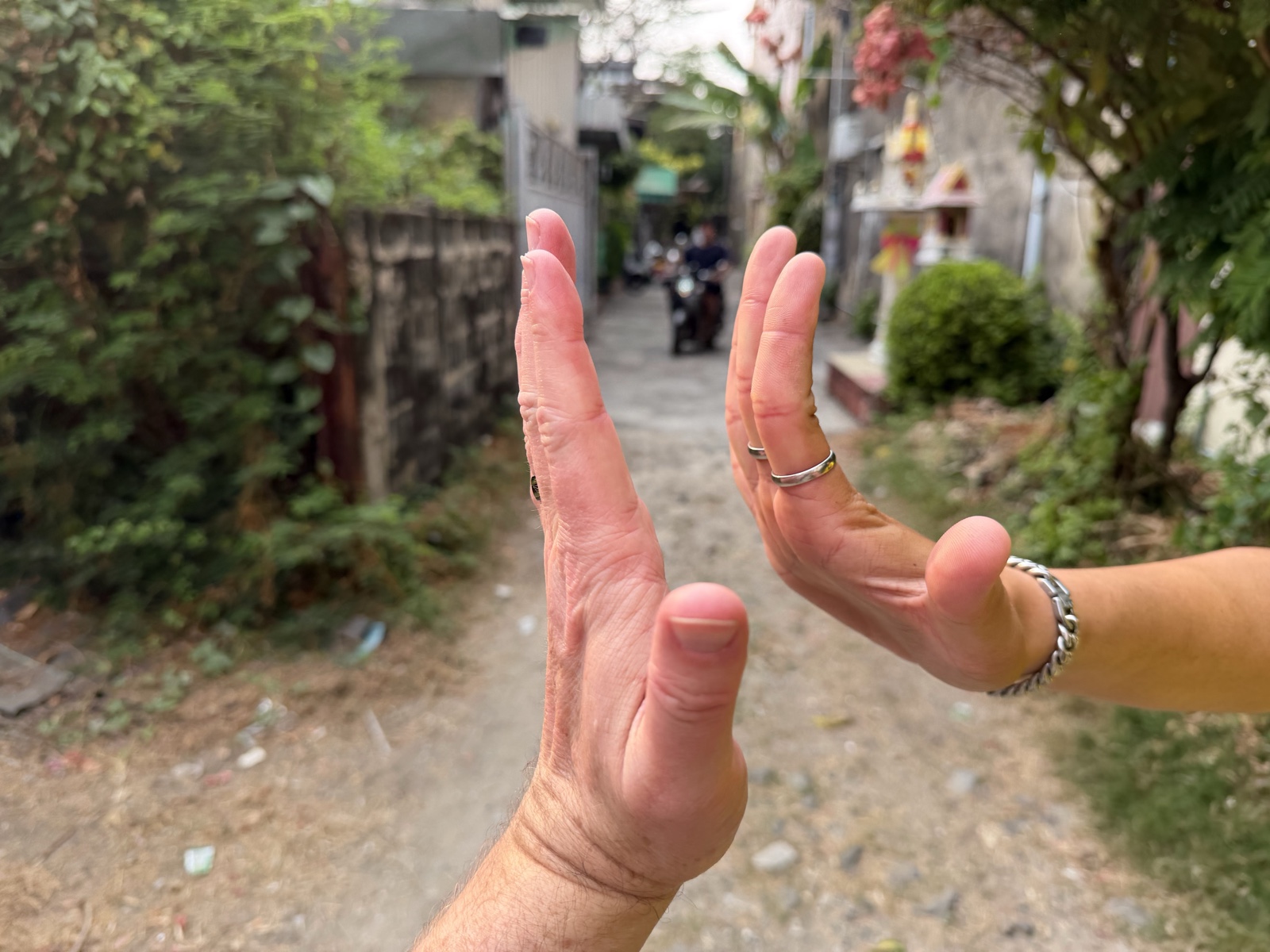 My grandfather Malcolm Merrill also had pictures of some traditional dances from Thailand, which I thought looked cool. I asked our guides about those dances, and they said that they learned them in elementary school. They couldn't resist doing some gestures with their hands as they talked about it, so I took a picture of my hand (bent back as far as I could go, which wasn't even flat) and one of theirs, to show how far back they conditioned their hands to go in order to make the curved shapes of those dances.