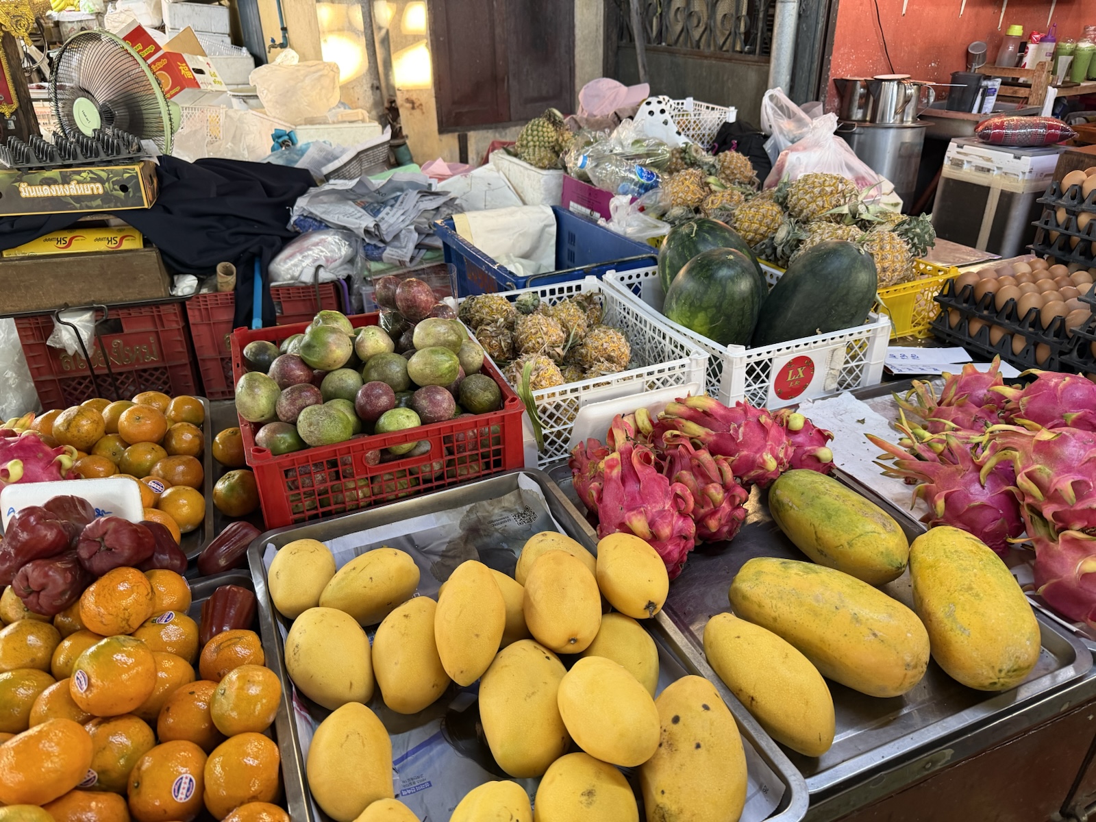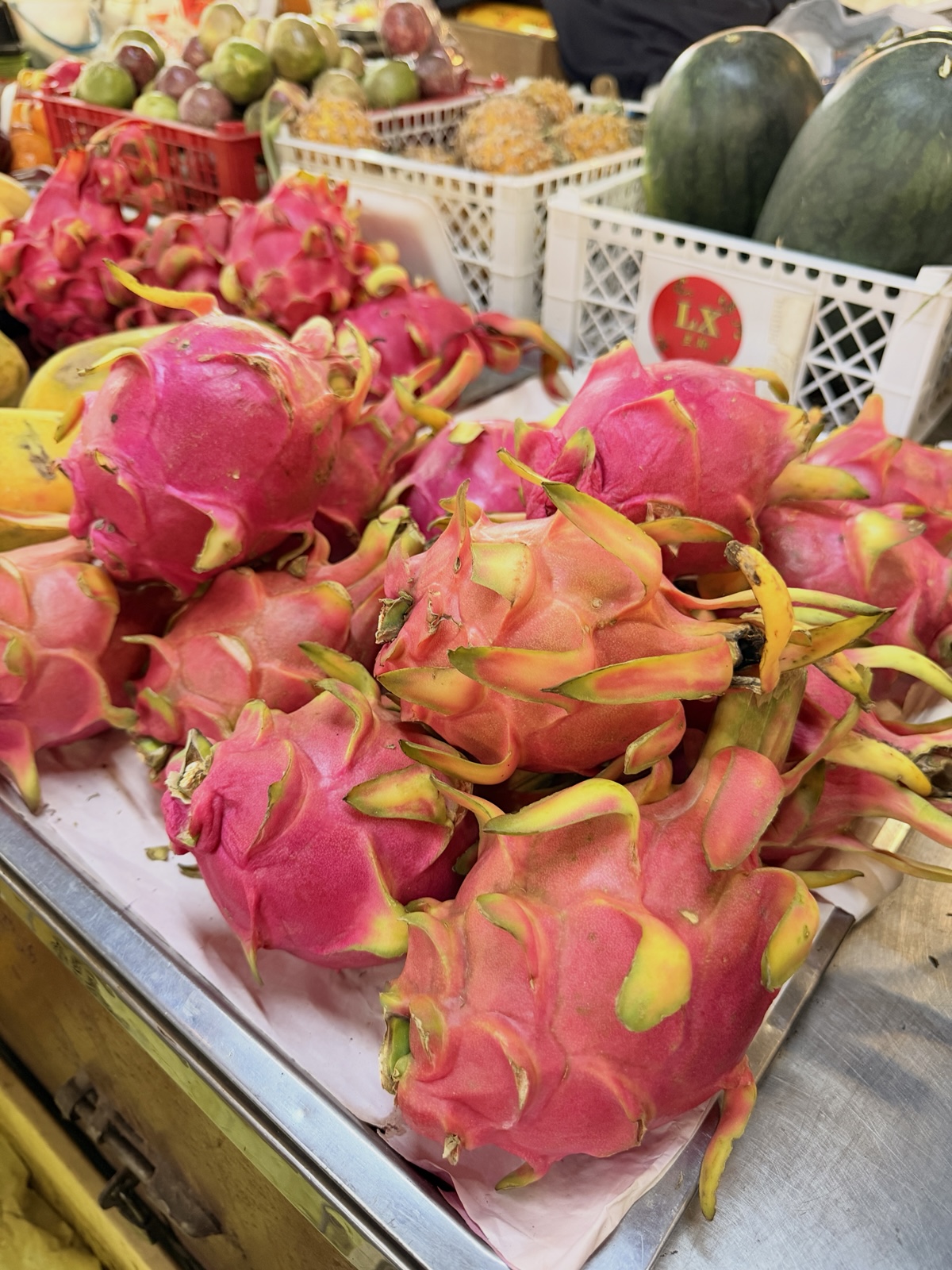 Here you can see oranges on the left, then mangoes (yellow), papayas (yellow-green), and the pink and spiky dragon fruit.