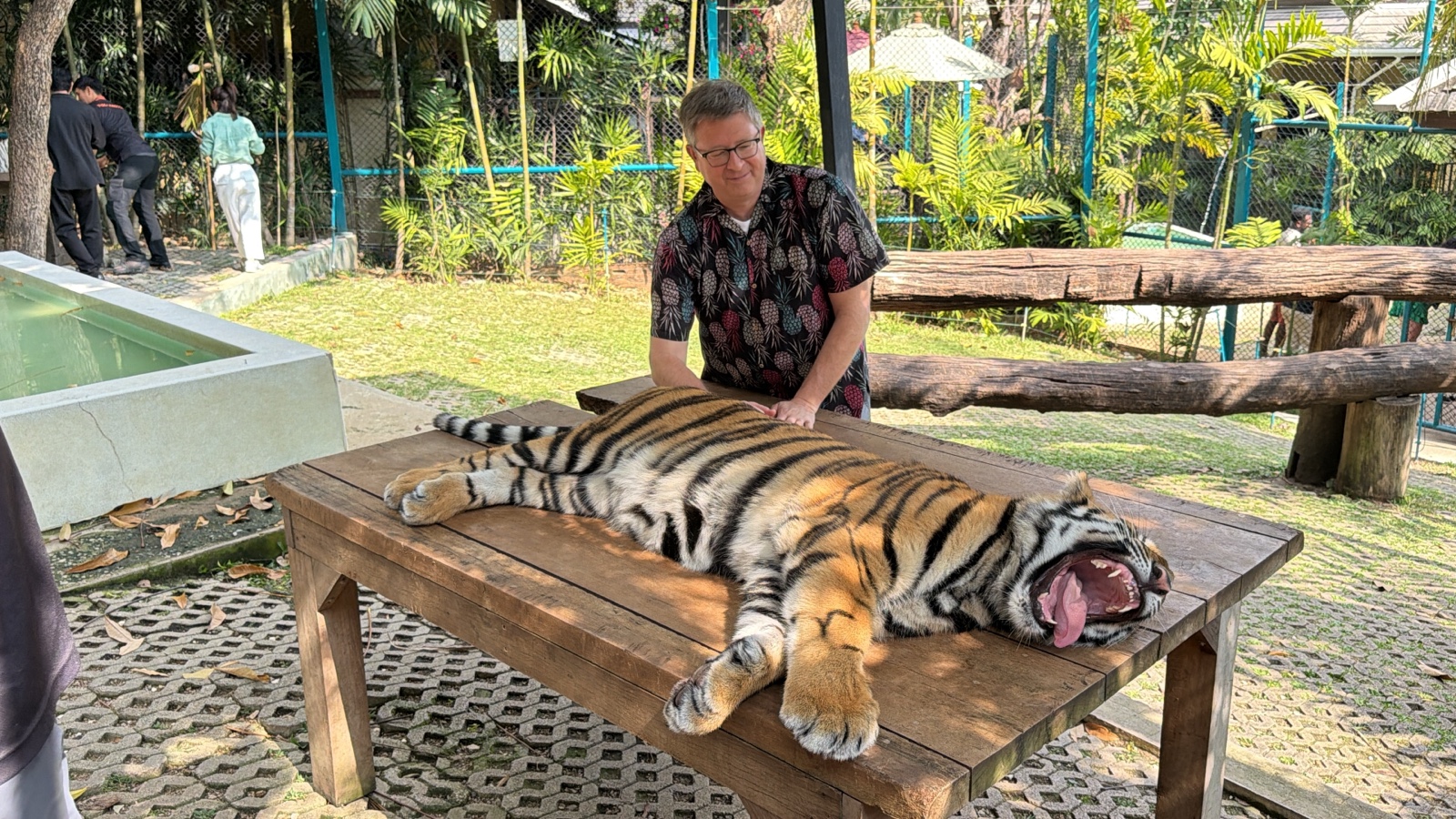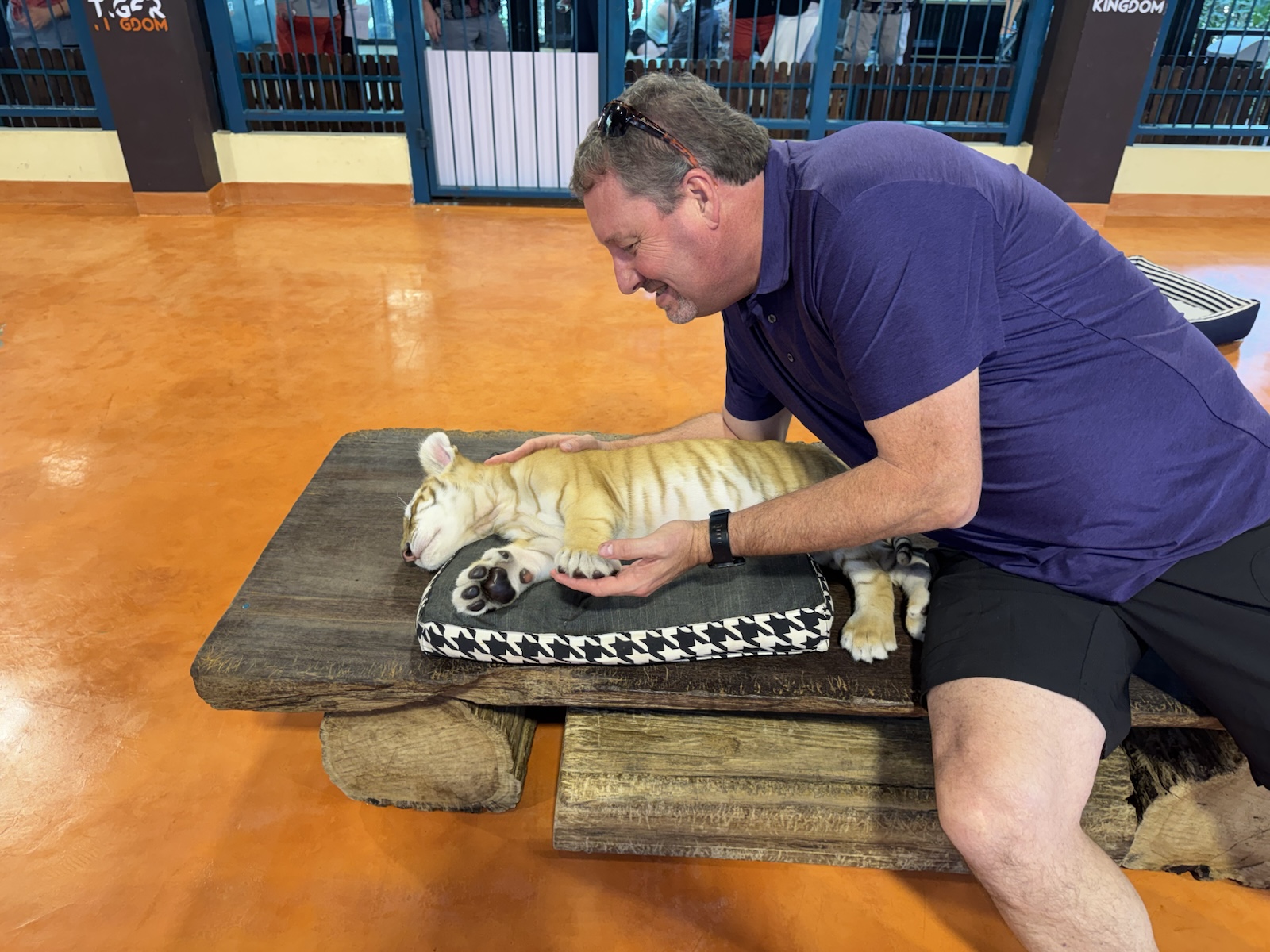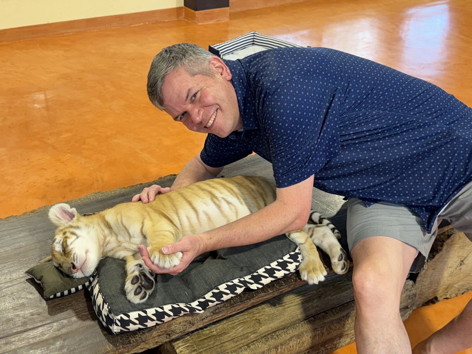Here I'm holding this tiger cub's paw (kind of a low, sleepy high-five).
