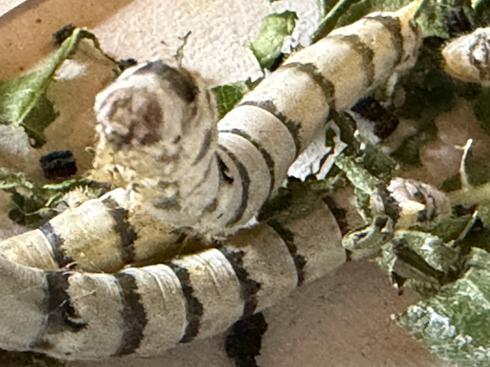 The eggs hatch and tiny caterpillars eat mulberry leaves until they are grown.