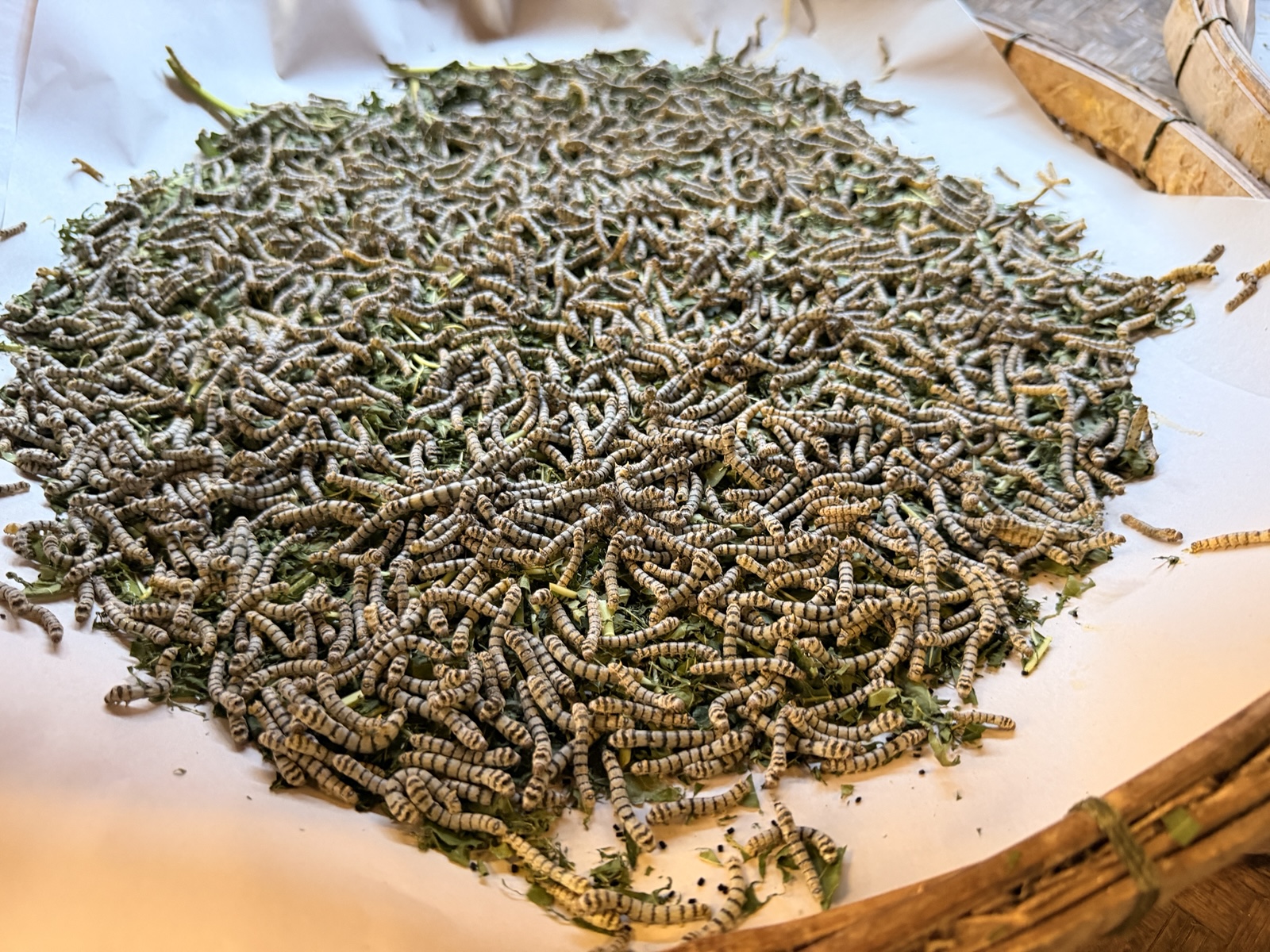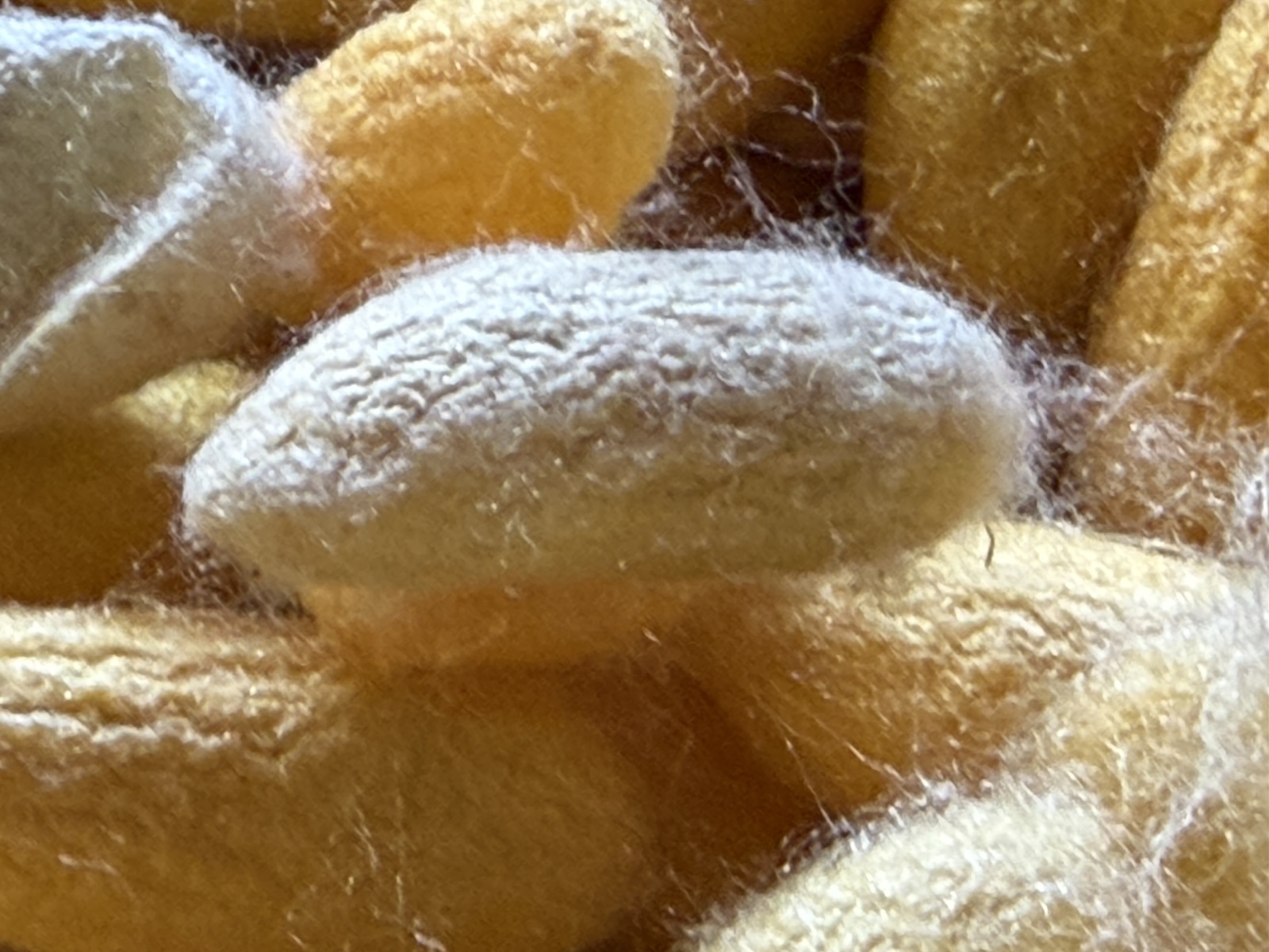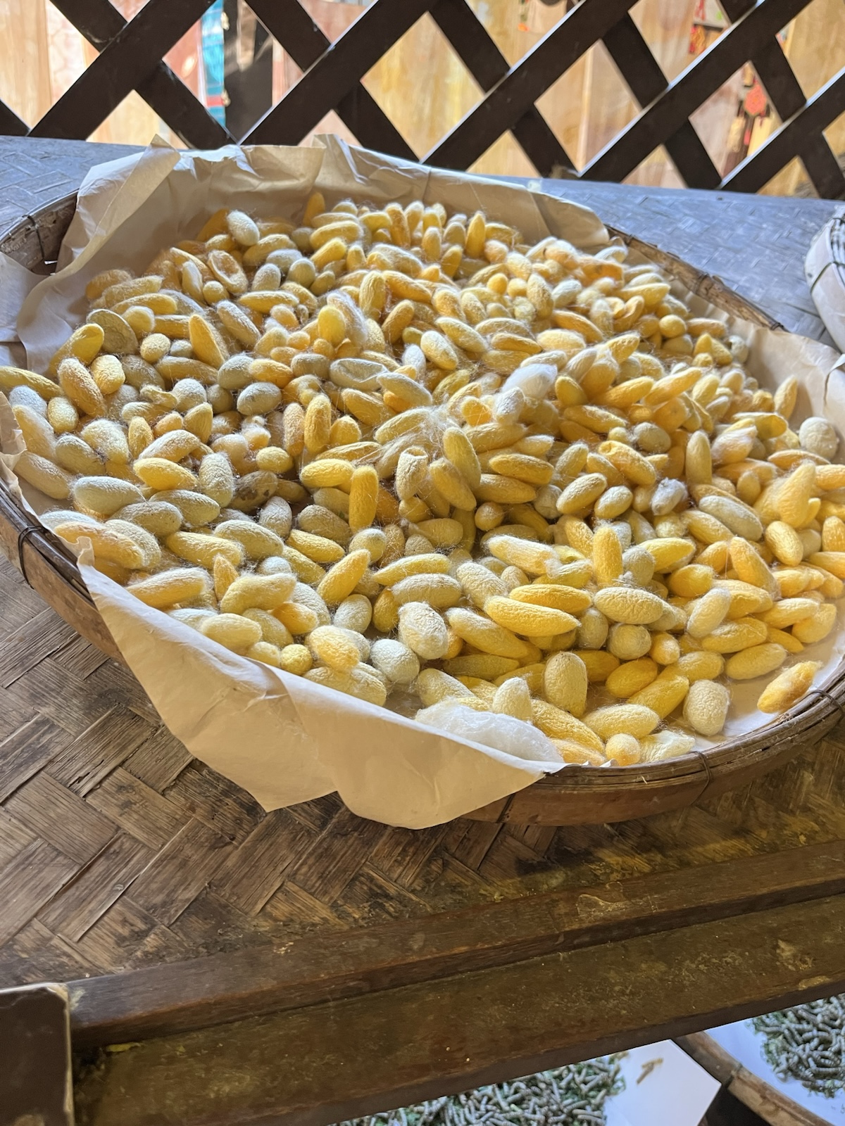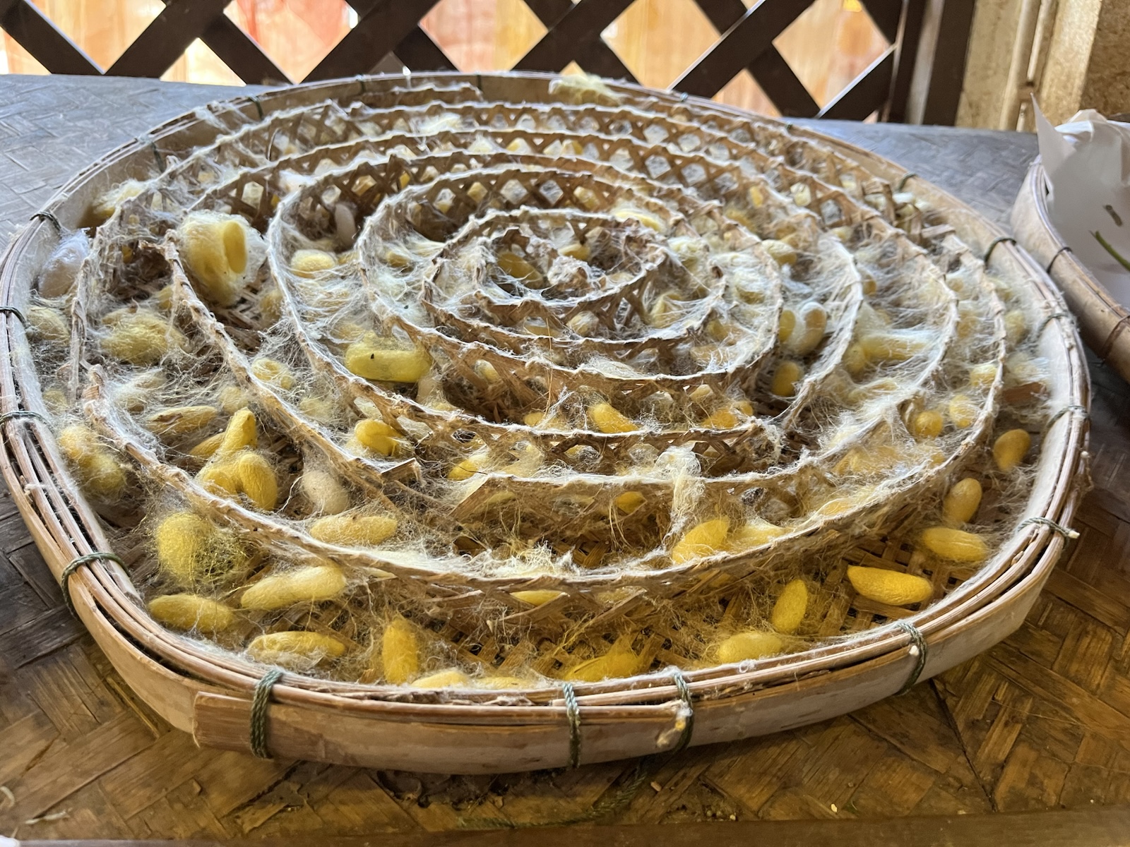 She occasionally adds cocoons to make sure there's a stead supply of thread. It was interesting how the cocoons just unravel to release their silk strands without getting tangled.