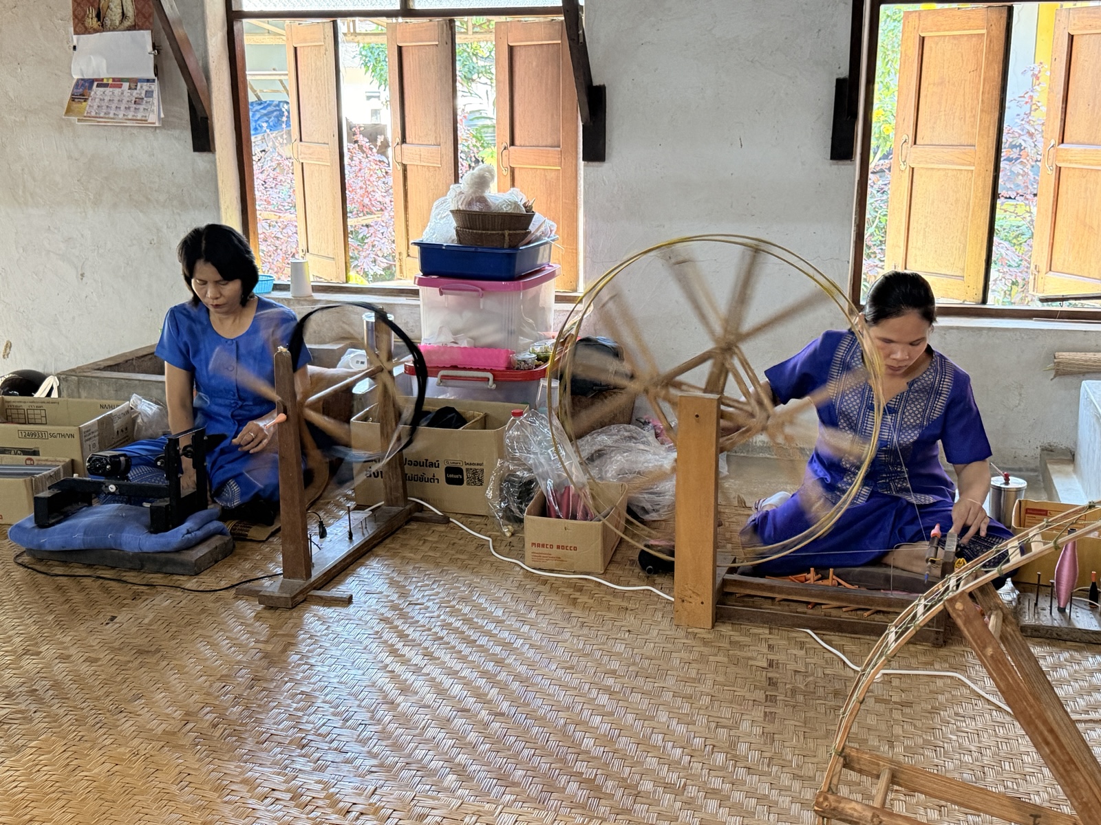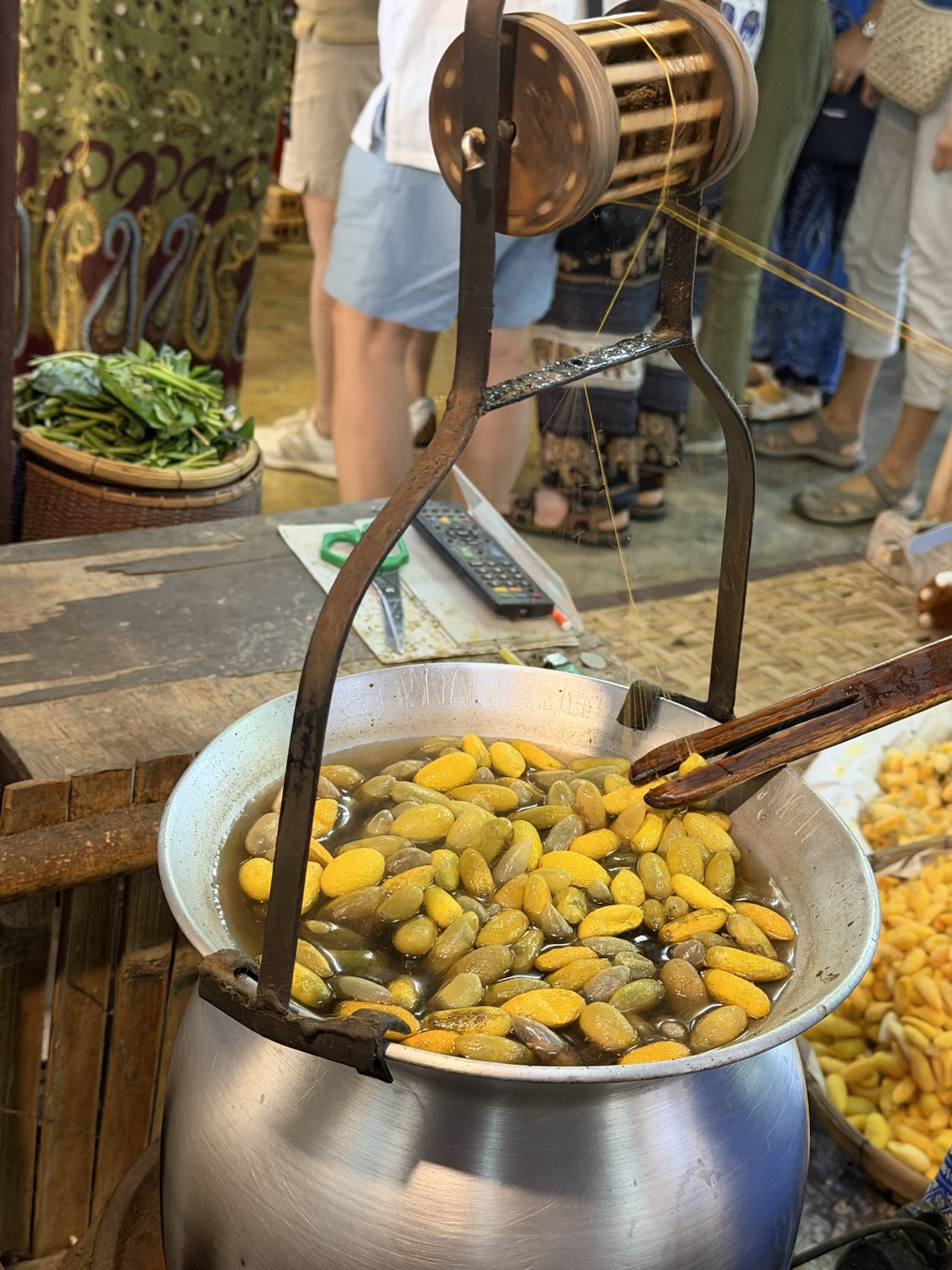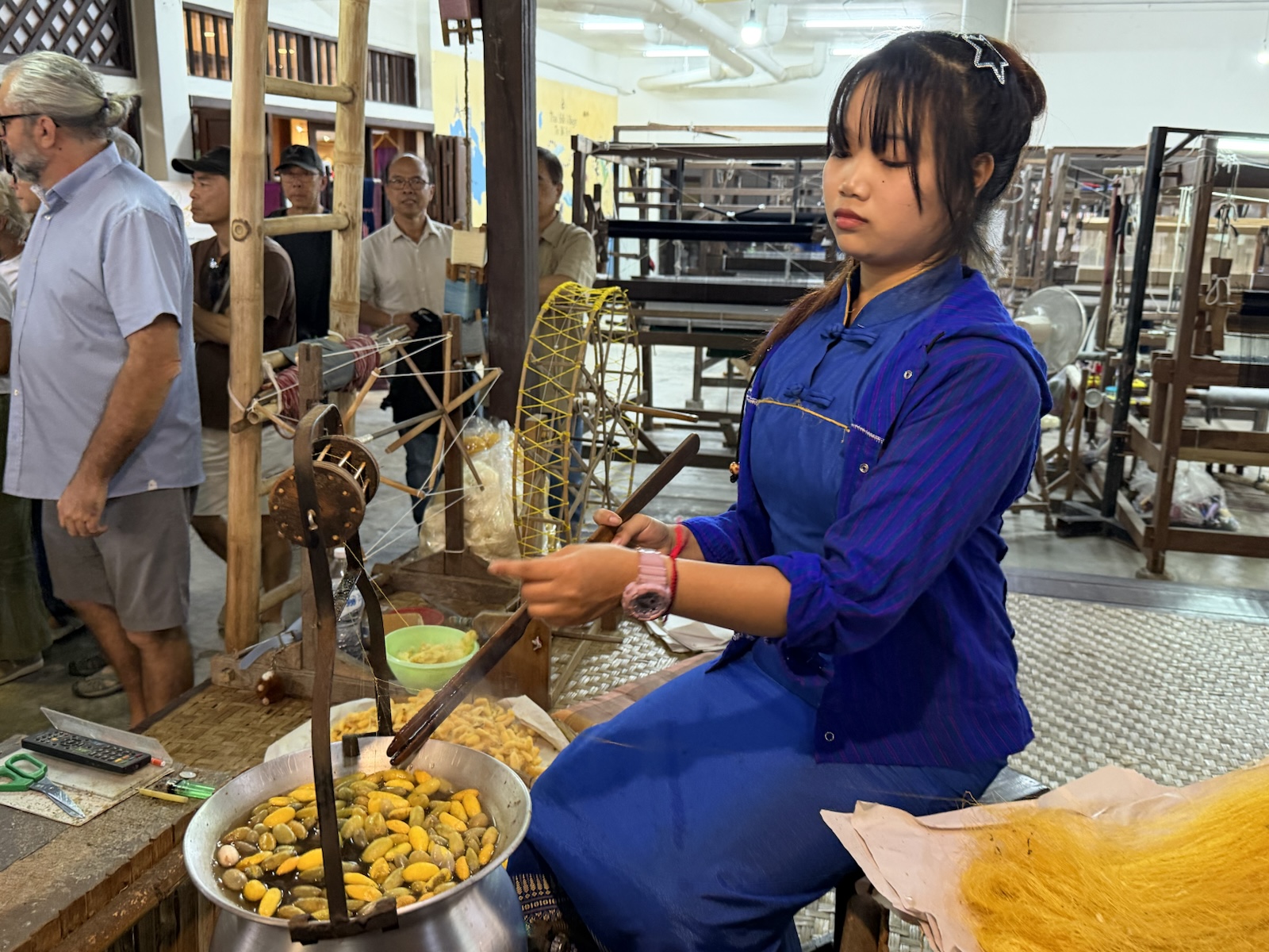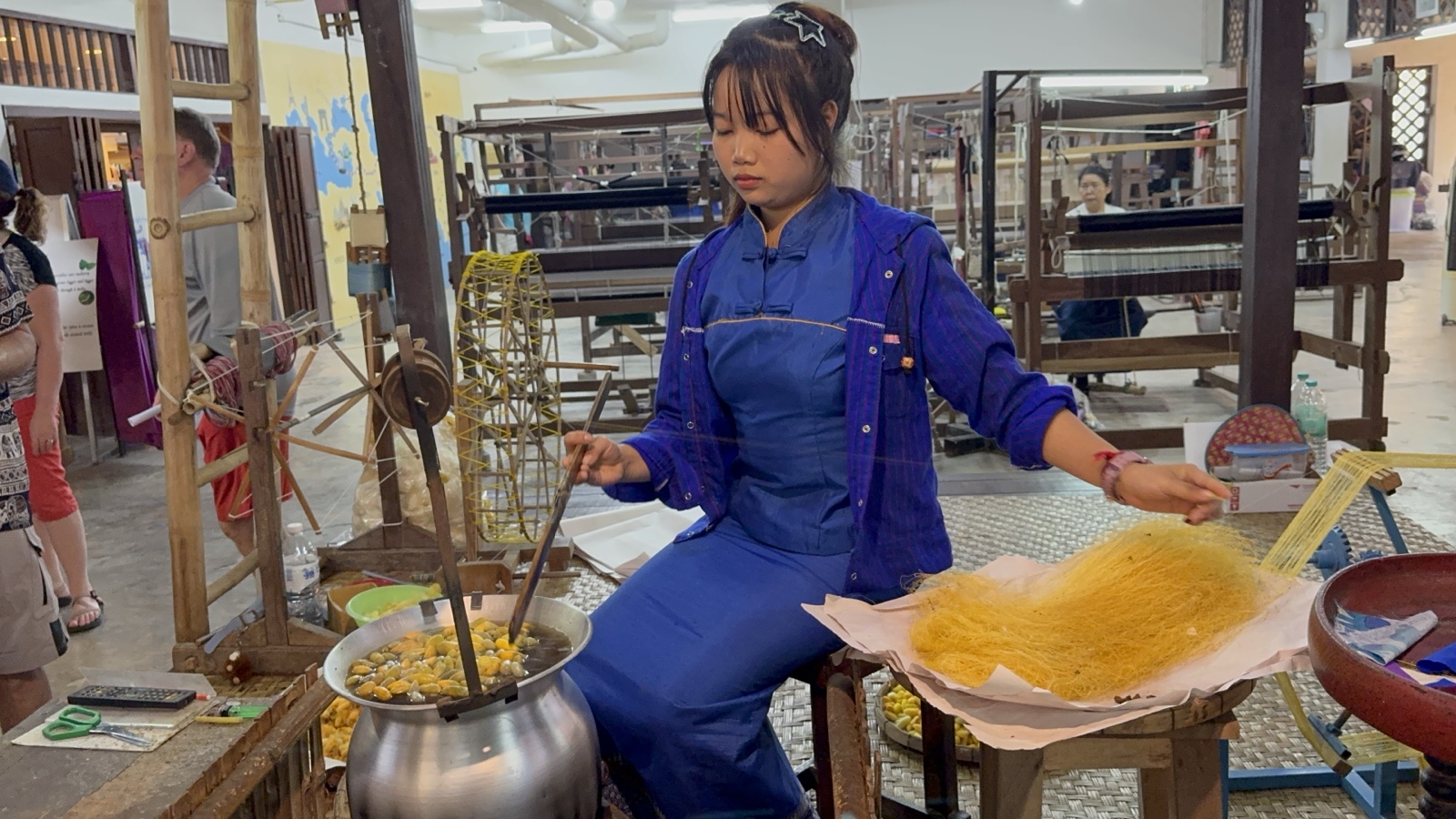 The cocoons are placed in a pot of liquid, and strands from several of them are wound across a wheel. This gal is spinning the wheel with her foot while she pulls the silk thread from the wheel and manages the cocoons with a stick.