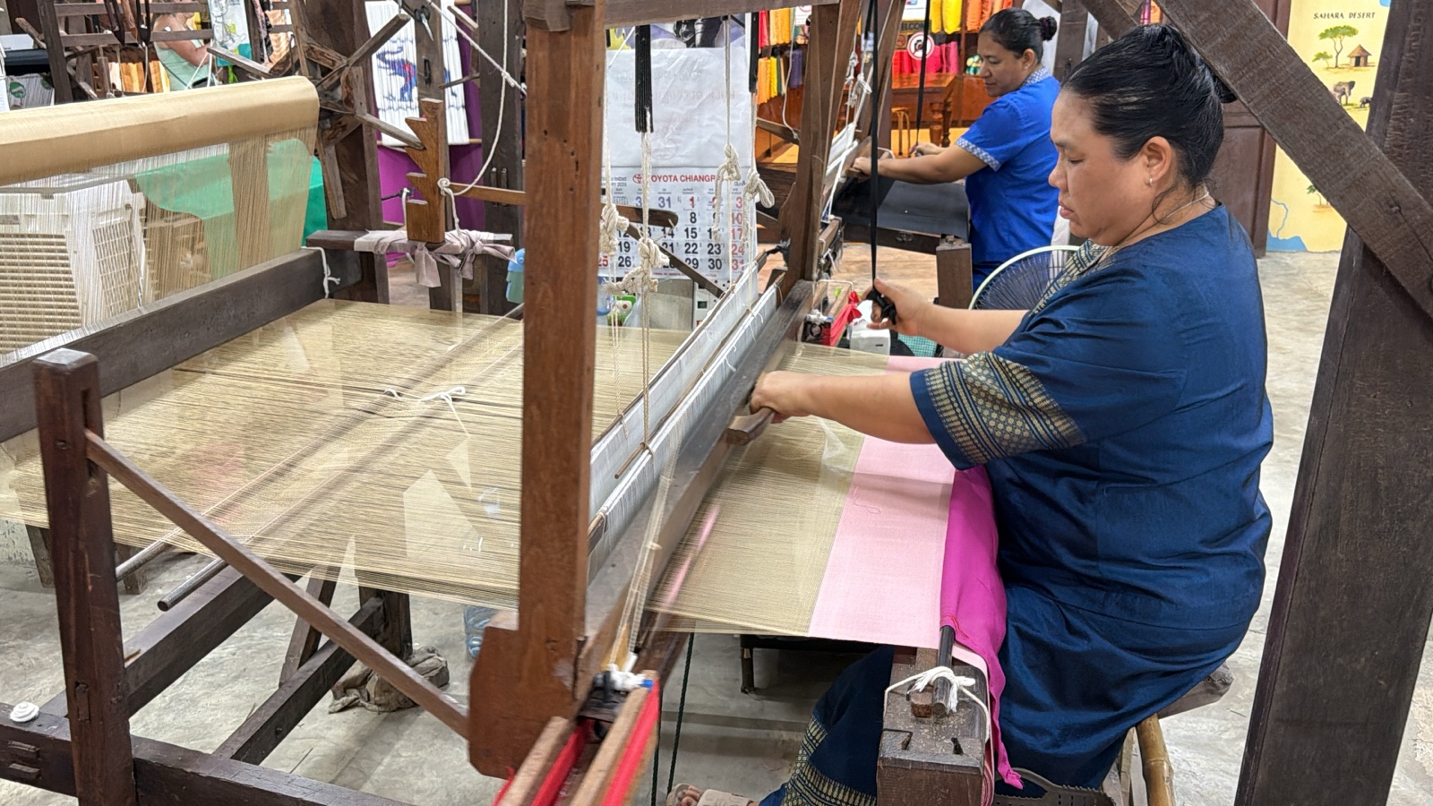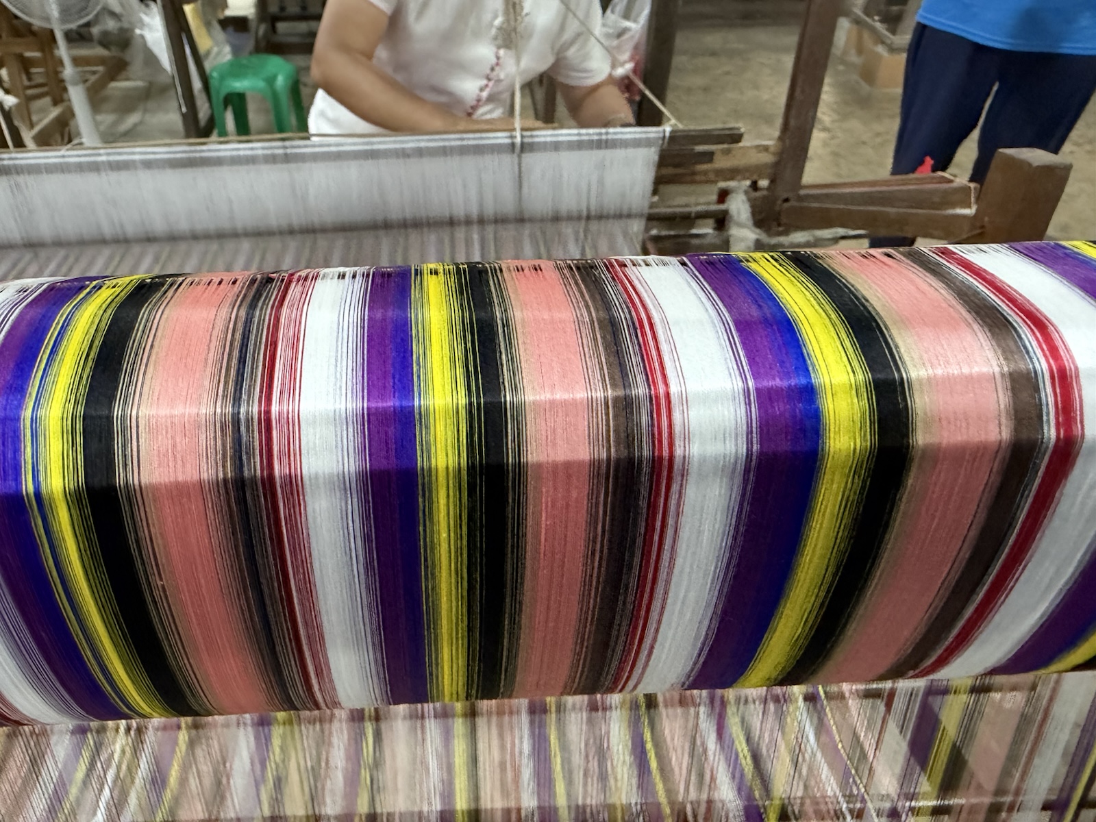 Then other ladies use a loom to weave the silk into fabric. They controlled the looms with their feet, shooting the shuttle from one side to the other, and pulling a handle to press each thread into place.