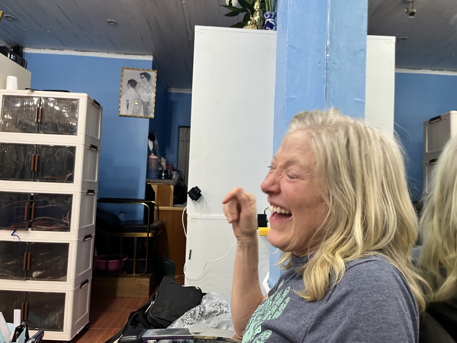 She laughed so hard that she made the workers crack up. They were laughing so hard that they had to go get tissues to wipe their eyes.