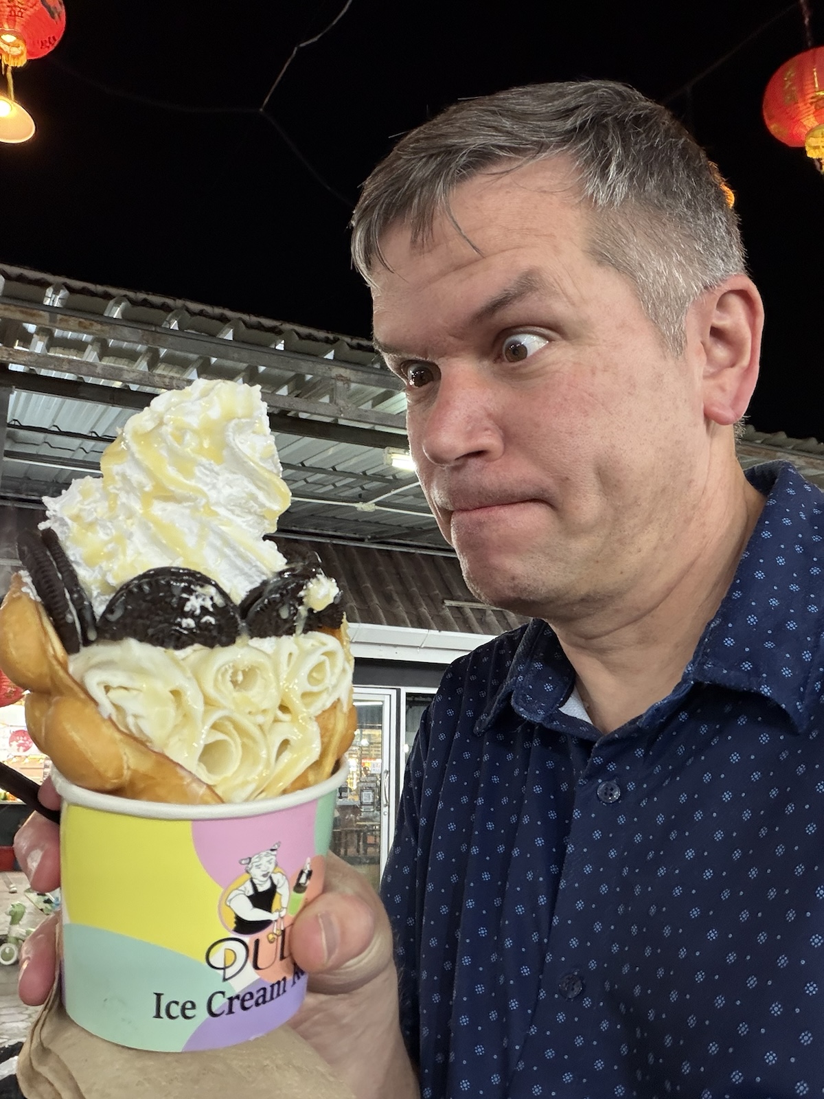 Later, I tried the Ice Cream Rolls. The guy pours the batter on a freezing plate and puts on a show as he rolls the ice cream up into a beautiful creation that is a bit awkward to eat.