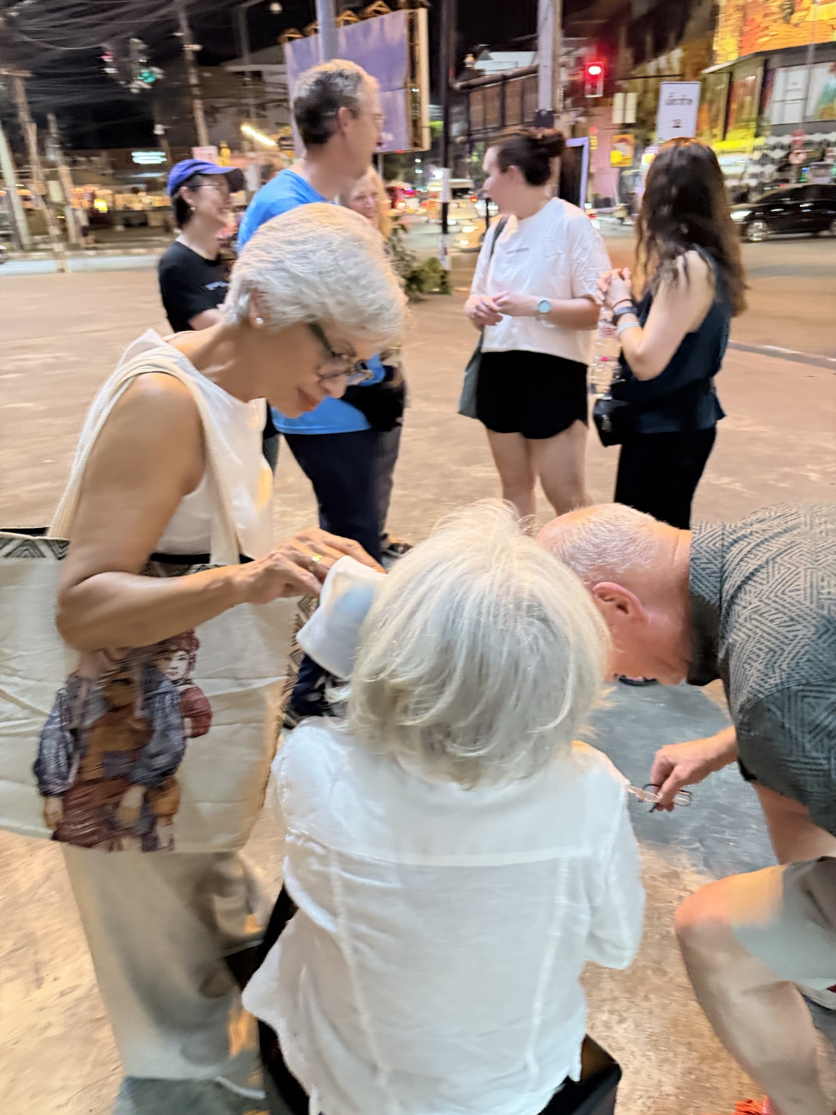 One incident I failed to mention earlier happened a couple nights before, when we were on our way back from getting massages and pedicures. As we turned the corner towards our hotel, we saw an elderly lady running to make the light at the crosswalk, and she tripped and fell on her face with a smacking sound. We ran over there to check on her, and she was bleeding a bit, so I ran to a nearby massage parlor and pantomimed the need for some tissues. The lady there gave me some, and someone also procured an ice pack.