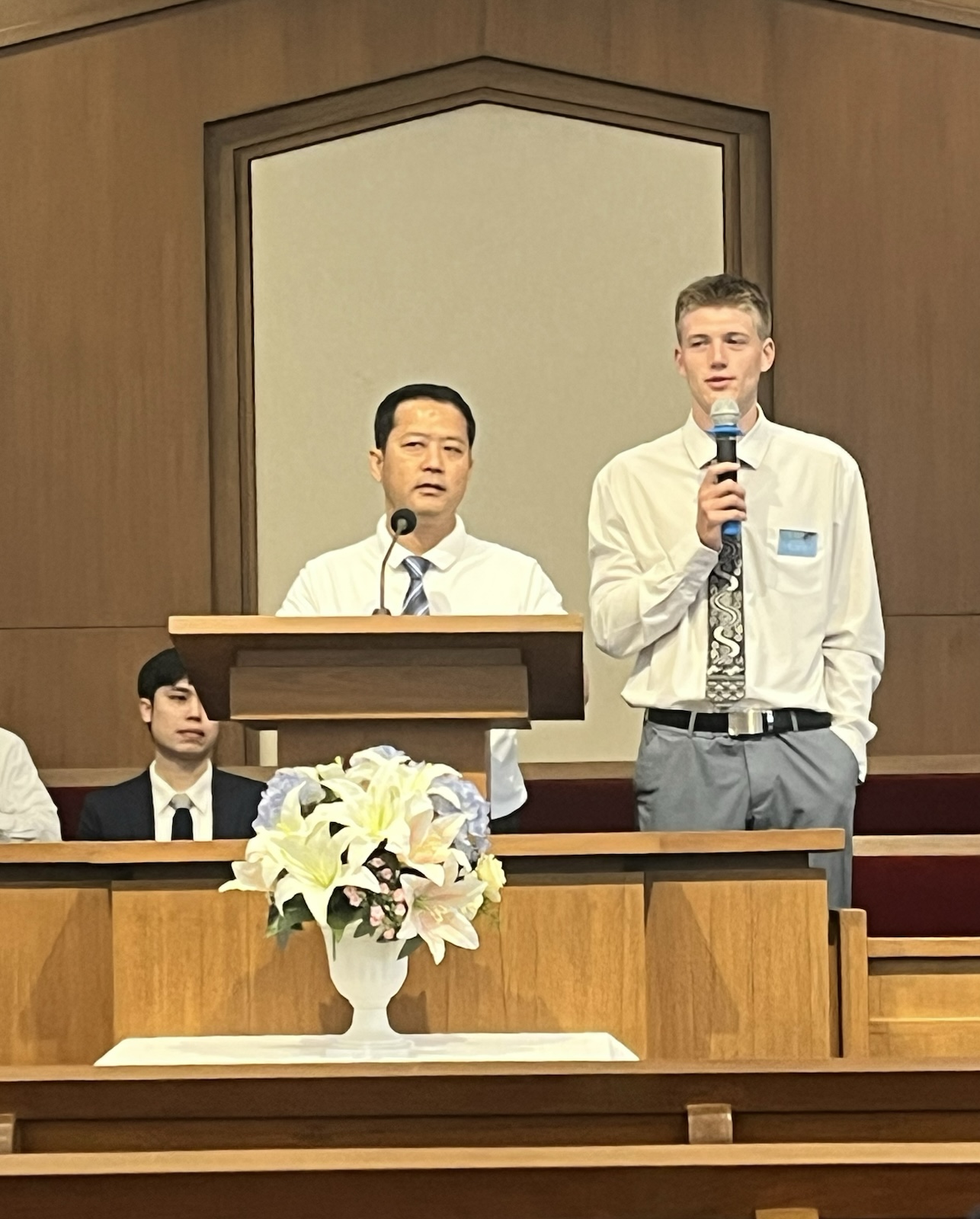 The congregation was about half English-speakers, so one of the elders stood up by the pulpit and translated whatever people said (in either direction). He was incredible.