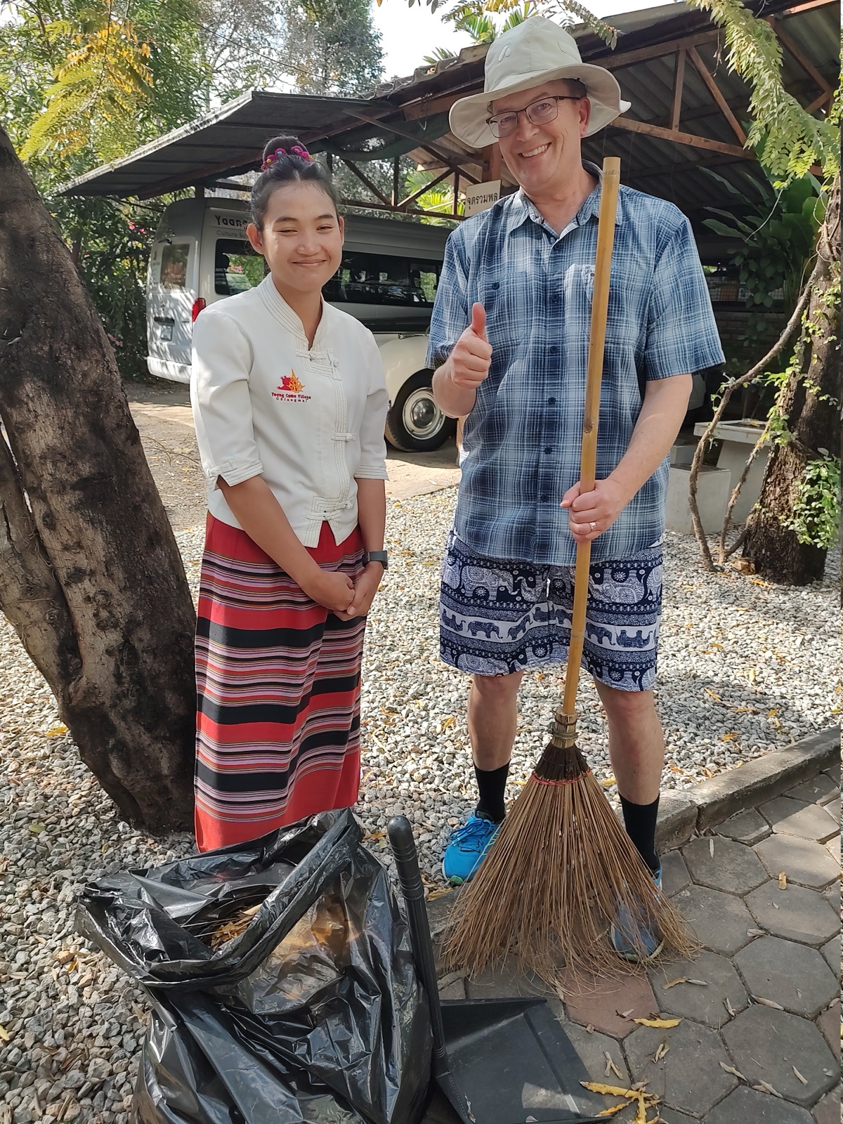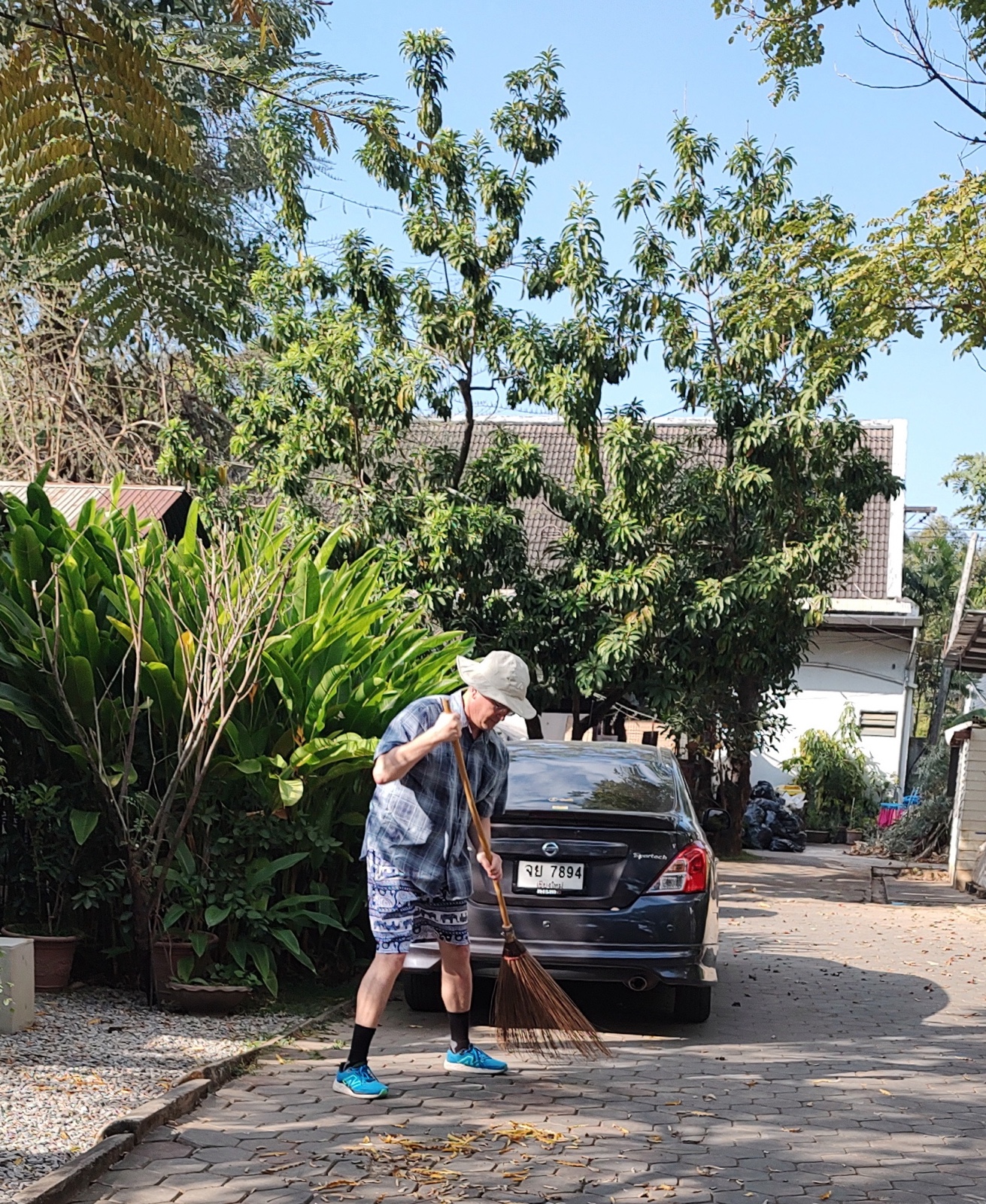 That afternoon, Landon got to try out sweeping like the locals do.