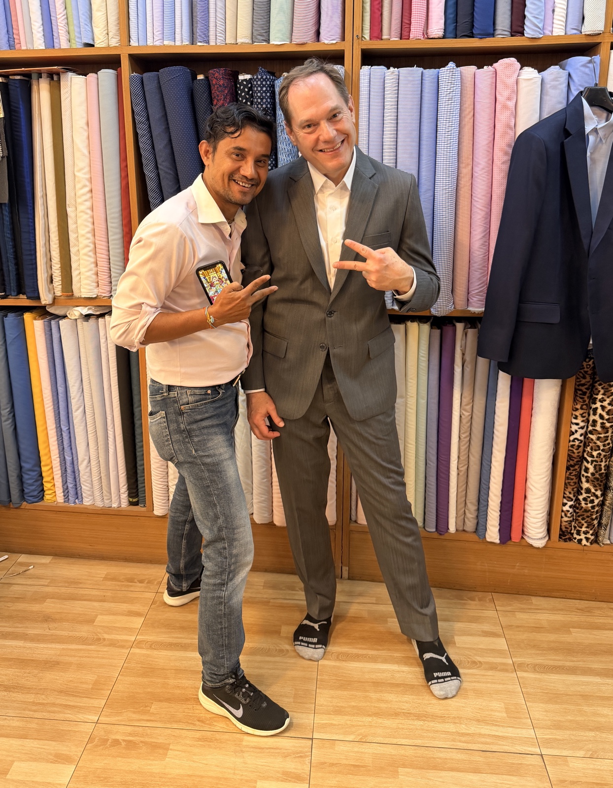 After we got back to the hotel, Roger walked down to the tailor shop and found that his custom-made suit was ready. It looked so sharp.