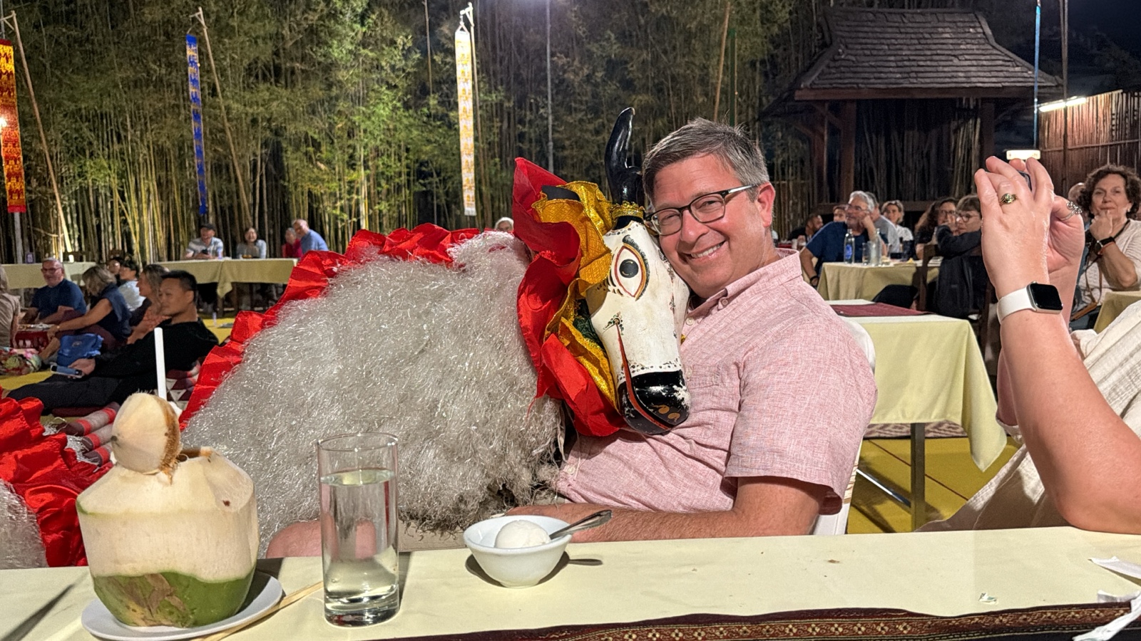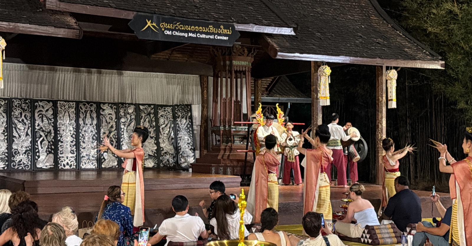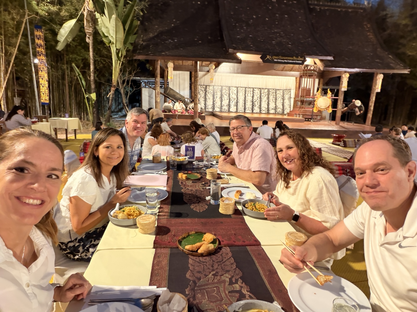 So I asked Darren about it, and he found a dance performance we could attend. Linette and I went with Sharon & Roger and Darren & Valerie to a "Khantoke" Dinner and traditional dance performance at the Old Chiang Mai Cultural Center.