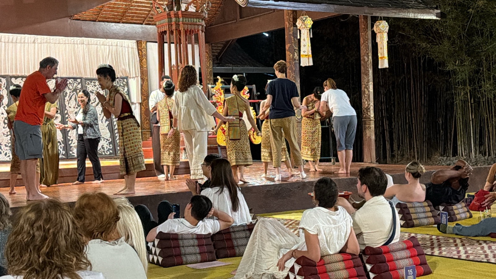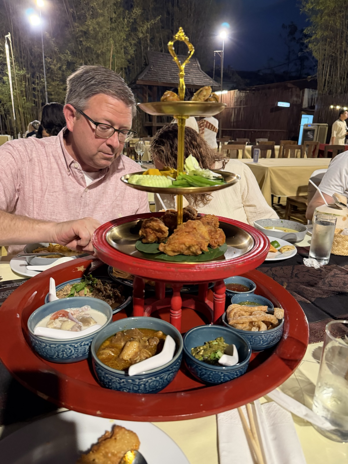 A "Khantoke" dinner is a traditional northern Thai (Lanna) dining experience. "Khan" means "bowl", and "Toke" refers to the low, circular pedestal tray that serves as the table. In our case, the food came out on a multi-layered platform, which seemed so fancy! We also had some great coconut soup and other dishes, and it was all very tasty.