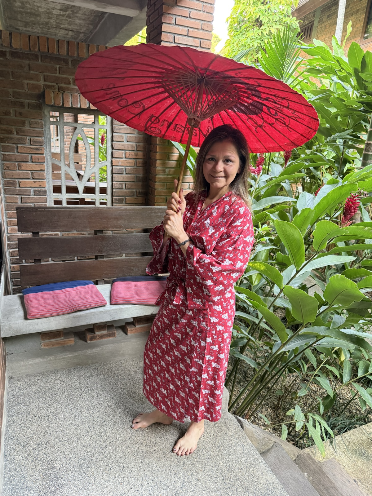 The next morning, Linette had fun with the robe and umbrella that were in our room.